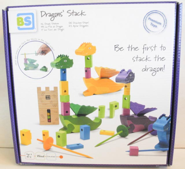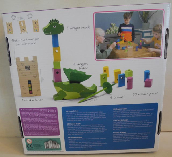 Schüttle den Turm, um die Farbreihenfolge zu bestimmen. Staple mit dem Schwert die richtigen Teile auf deinem Drachen, wer als erstes den Kopf aufsetzt, gewinnt. Geschicklichkeitsspiel aus Holz. Enthält 4 Drachenkörper, 4 Drachenköpfe, 4 Schwerter, 20 Holzteile und einen Holzturm.