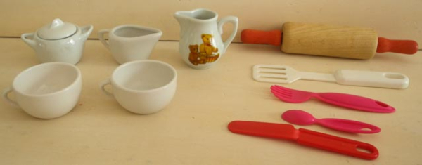 Walholz, Service mit 2 Farben, Krug, Zuckerdose, wenig Besteck.