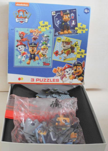25 Teile, 36 Teile, 49 Teile. ab 4 Jahren. von Nickelodeon. Bei einem Puzzle 2 Teilchen abgebrochen. Schachtel etwas abgenutzt.